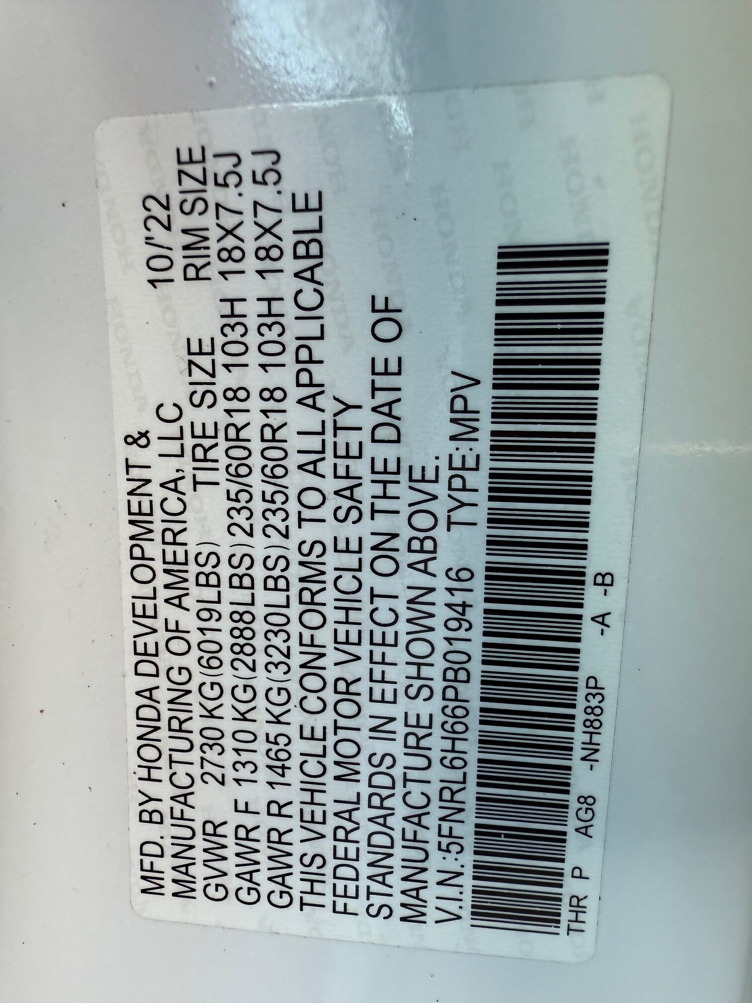 • VIN Number 5FNRL6H66PB019416